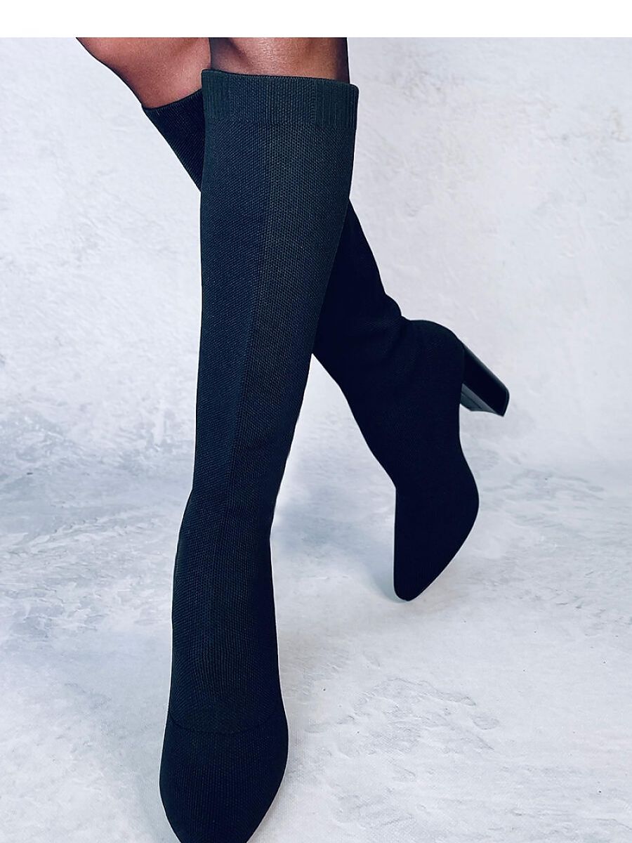 Women's boots with a flexible upper on a full-face post. They have a graceful cut with almond toes and a straight heel of 9,5 cm height, which will magnificently slenderize your silhouette.... The shoes are made of sock fabric, so they are perfectly fitted. Do not wait and order them today : ) Warming - soft fur in the foot part.