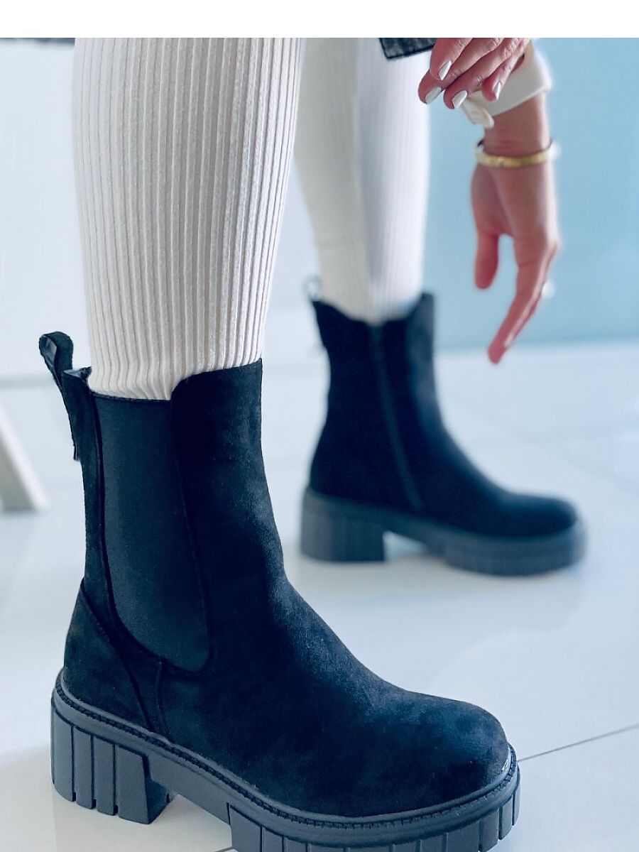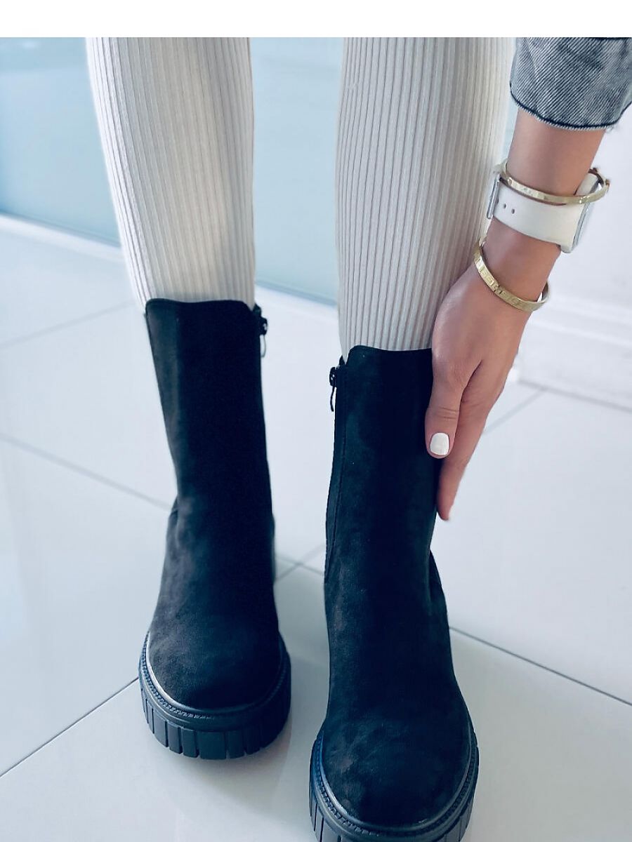 Women's booties - slippers on a thick sole. The model is distinguished by a minimalist cut with a fashionable high upper. A practical zipper closure ensures quick and effortless putting on, and an elastic insert on the side refers to the sable. They are made of eco-suede, on a foam lining.