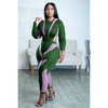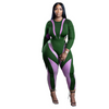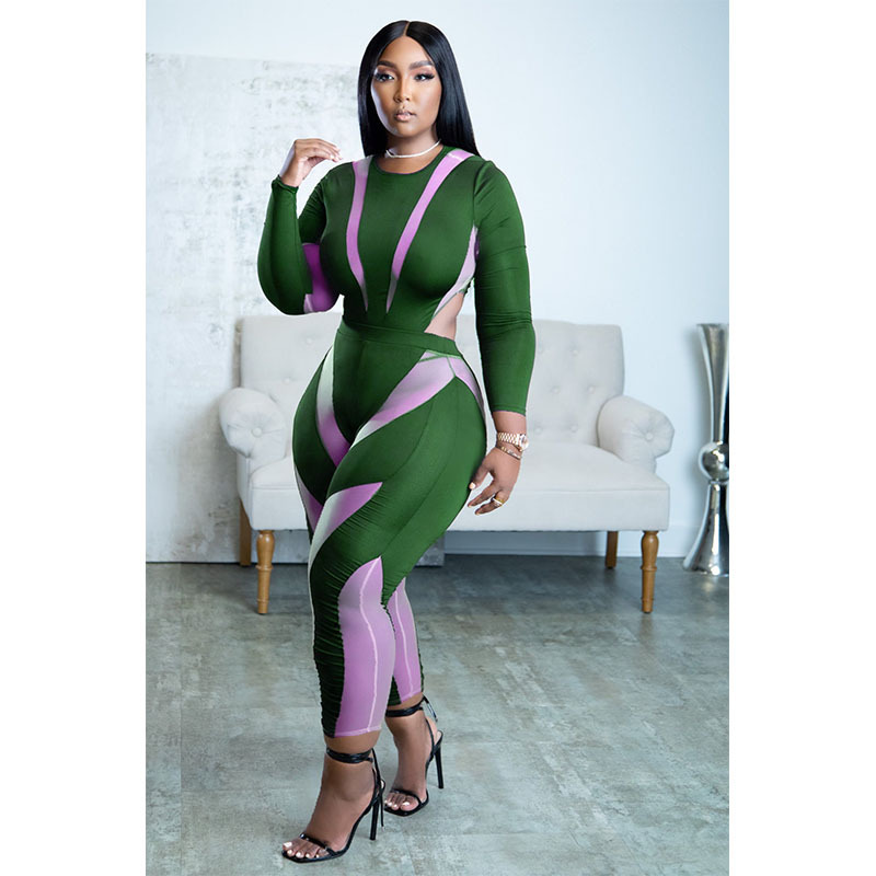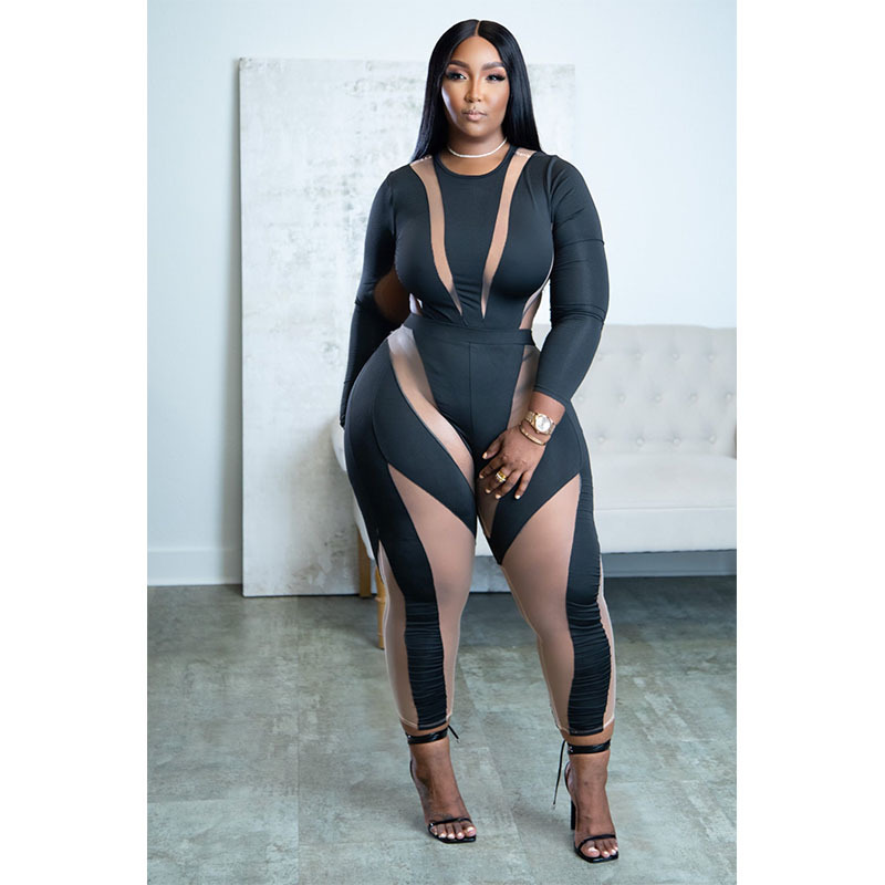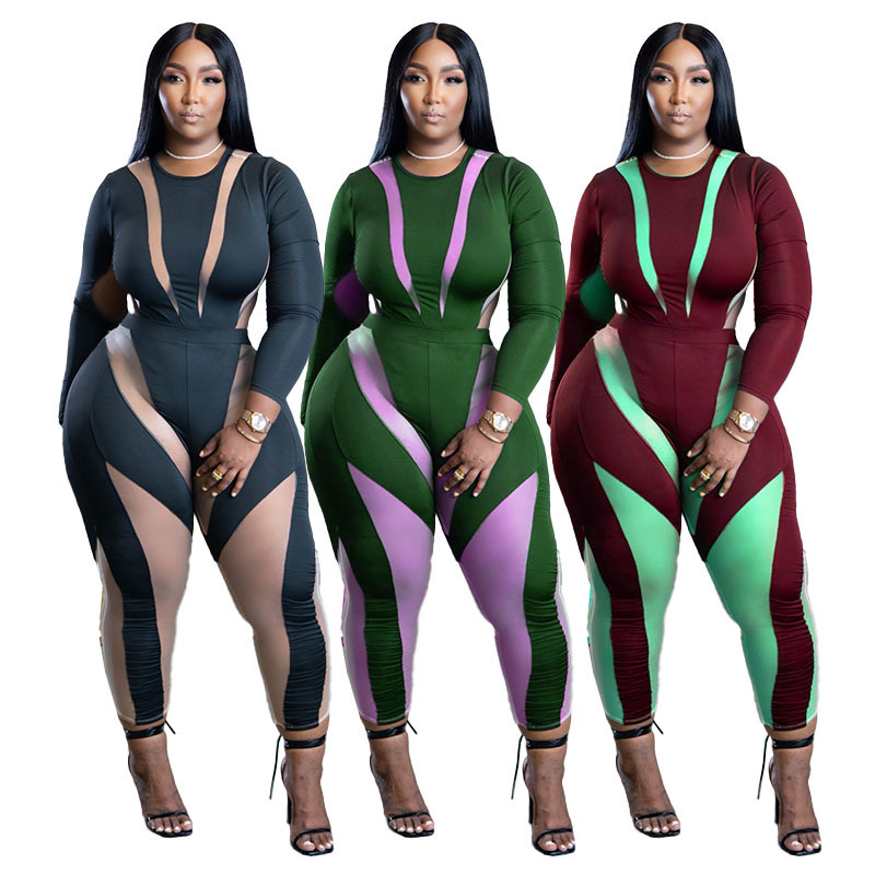 Plus Size Women Mesh Panel Round Neck Long Sleeve High Waist Slim Jumpsuit
