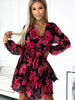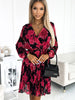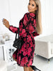 Pleated chiffon dress with neckline, long sleeve and belt. Dress made of fabric with red roses on a black background. Brand numoco. European production.