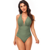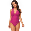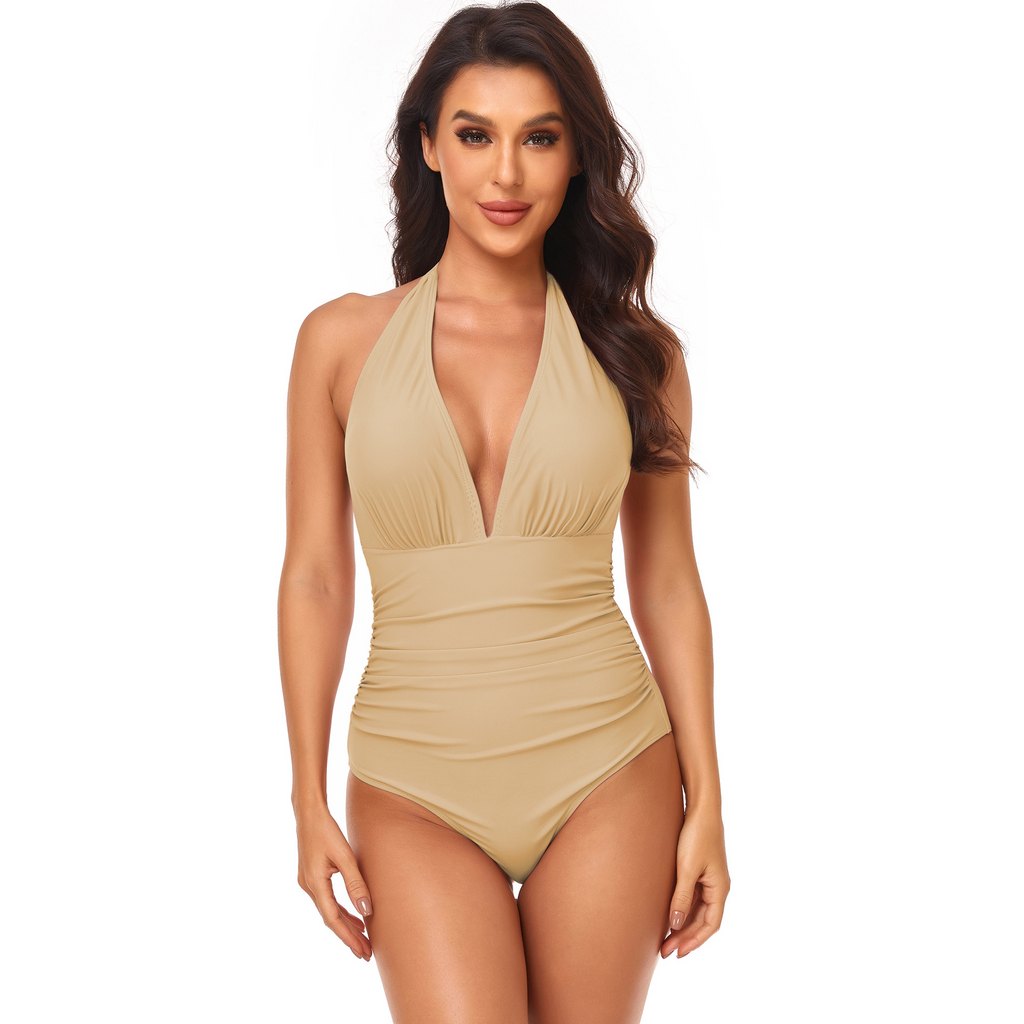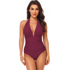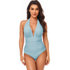 Women Simple Solid Color Shirring Halter Neck One-Piece Swimwear