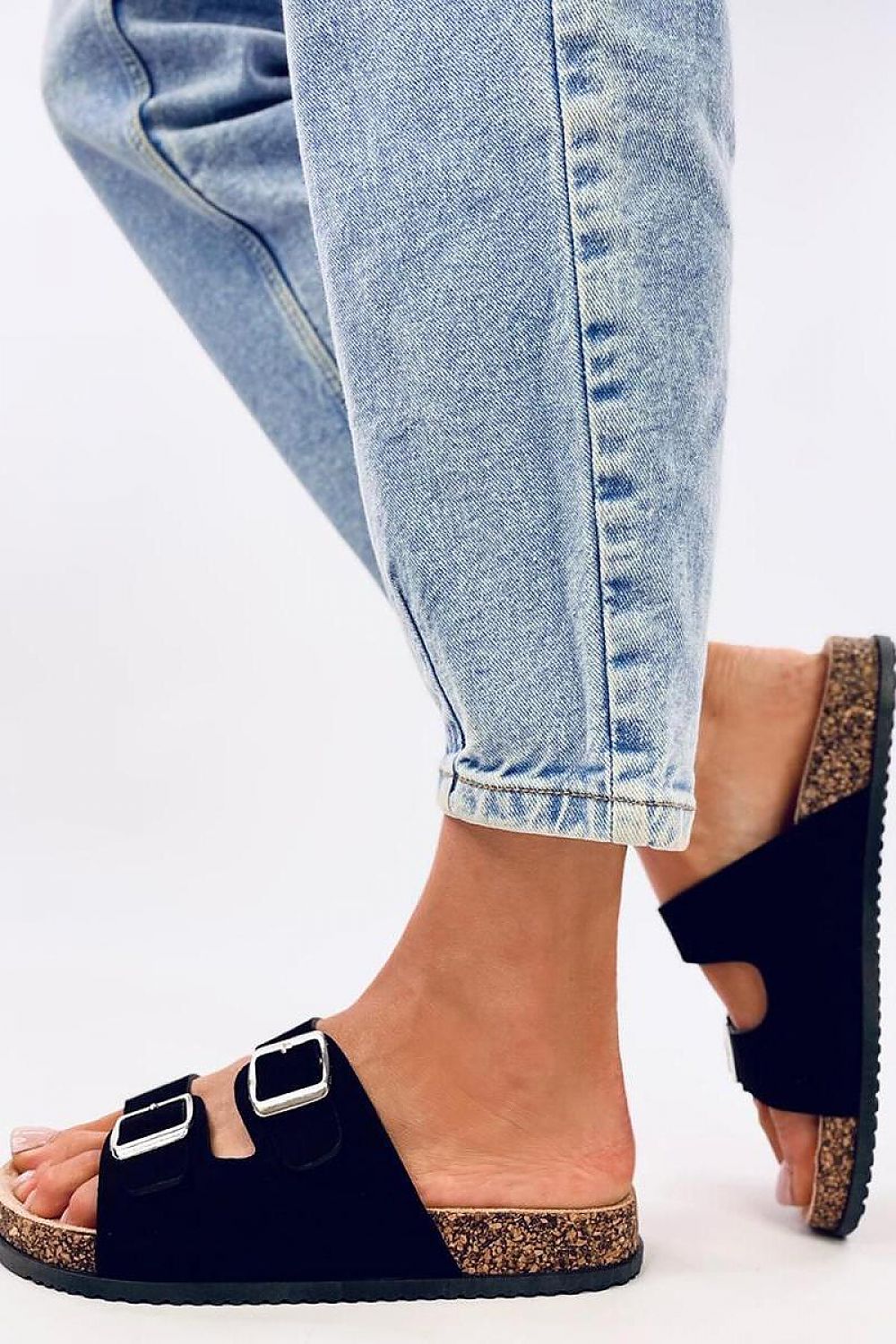 Women's suede slides on a cork sole. Adjustable buckles ensure a perfect fit to the foot, and the contoured insole guarantees comfort with every step ? see for yourself! These are the perfect shoes for summer : ) Outer material - eco-suede.