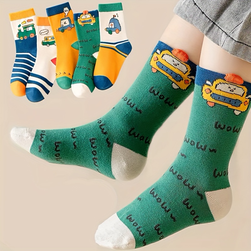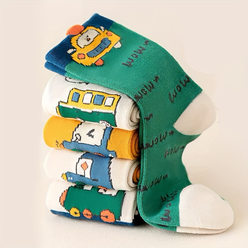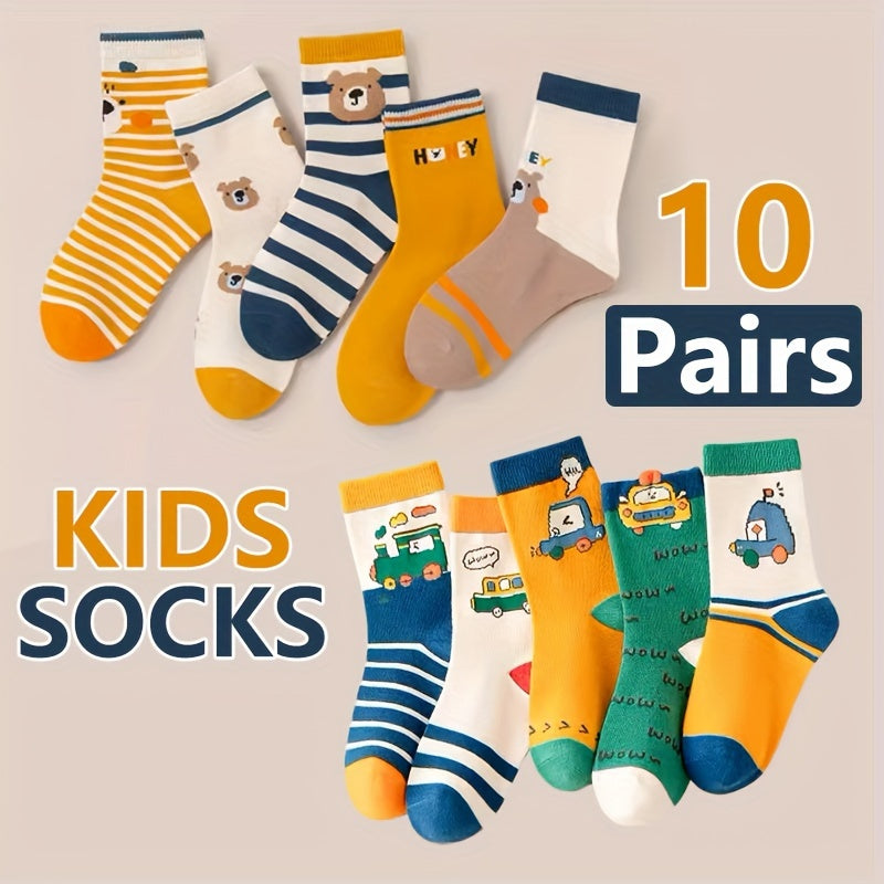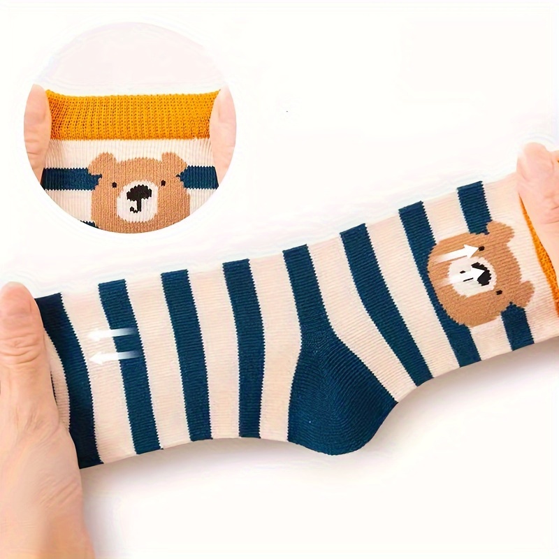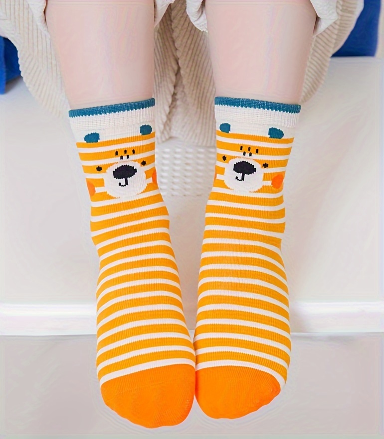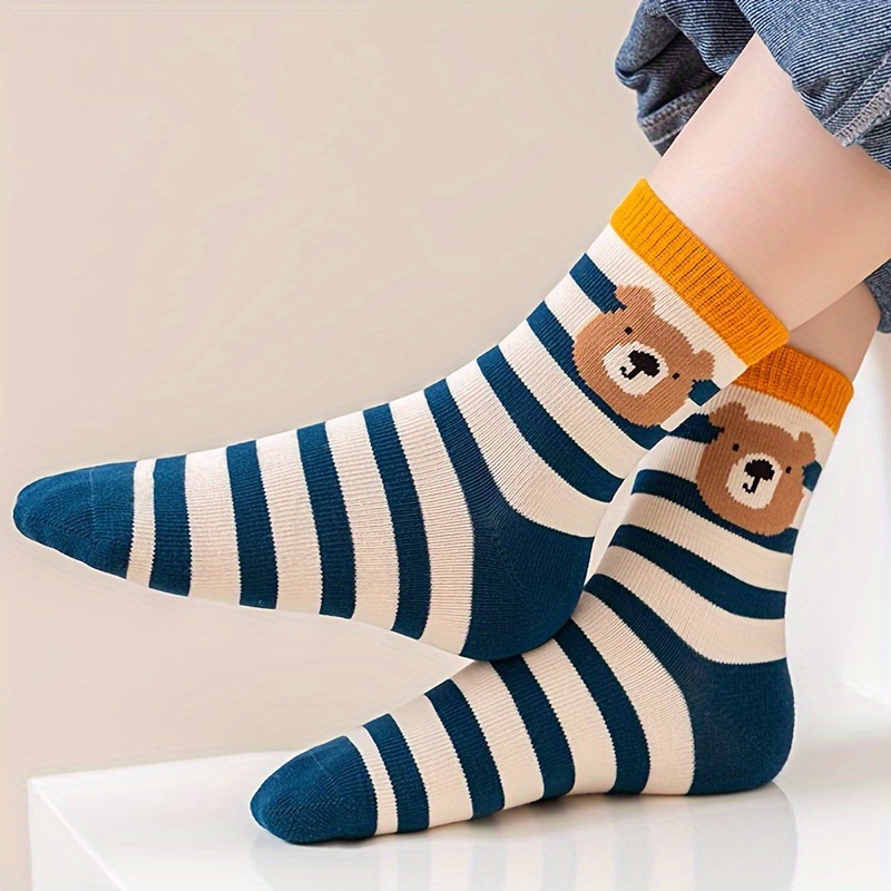 10-Pair Pack Children's Cute Bear and Striped Cartoon Calf-Length Socks, Polyester Blend Comfort Fit for All Seasons,FS
