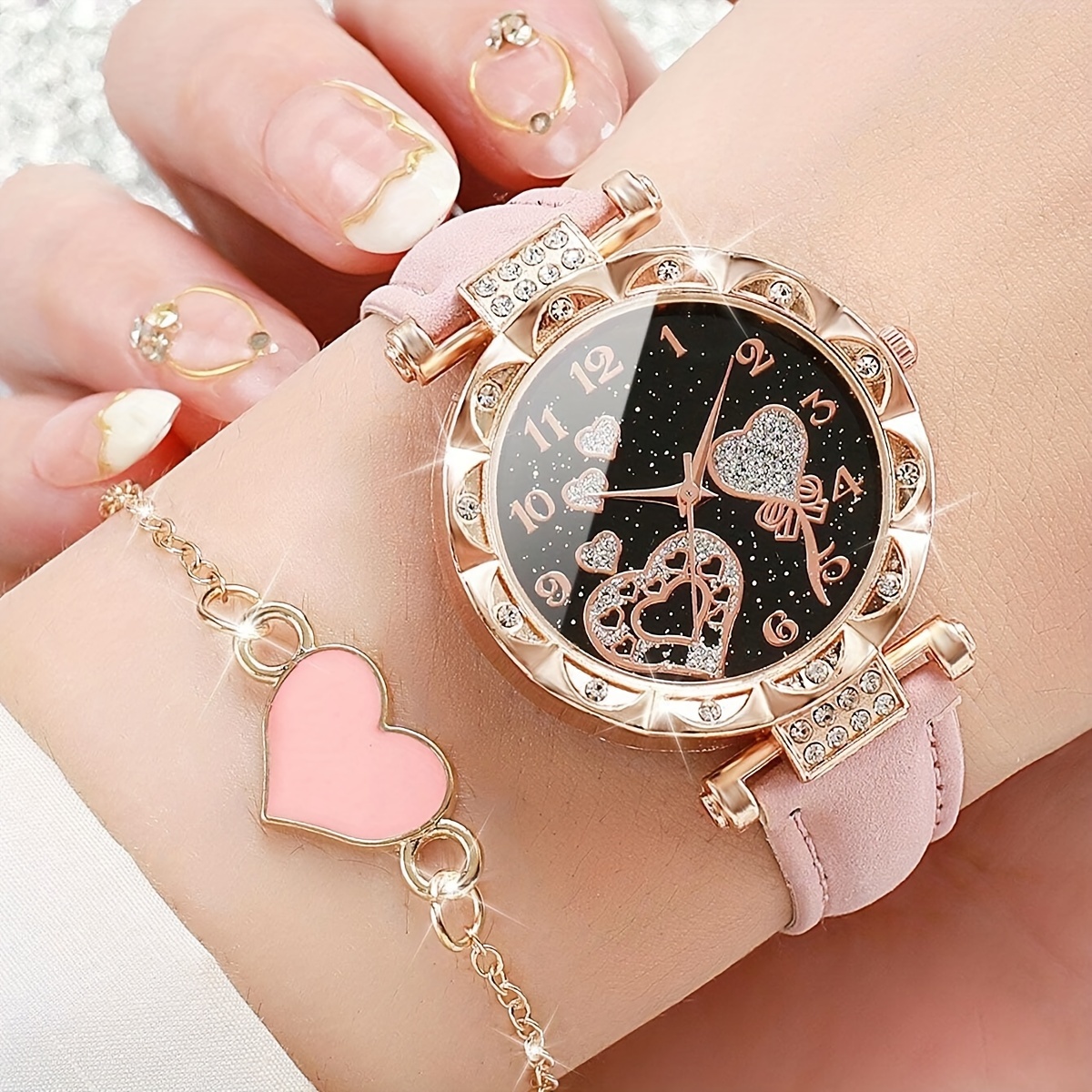 2pcs/set, girls' Fashion Cute PU Leather Girls Quartz Wrist Watch & Heart Bracelet Set, Ideal For Holiday Gift FS