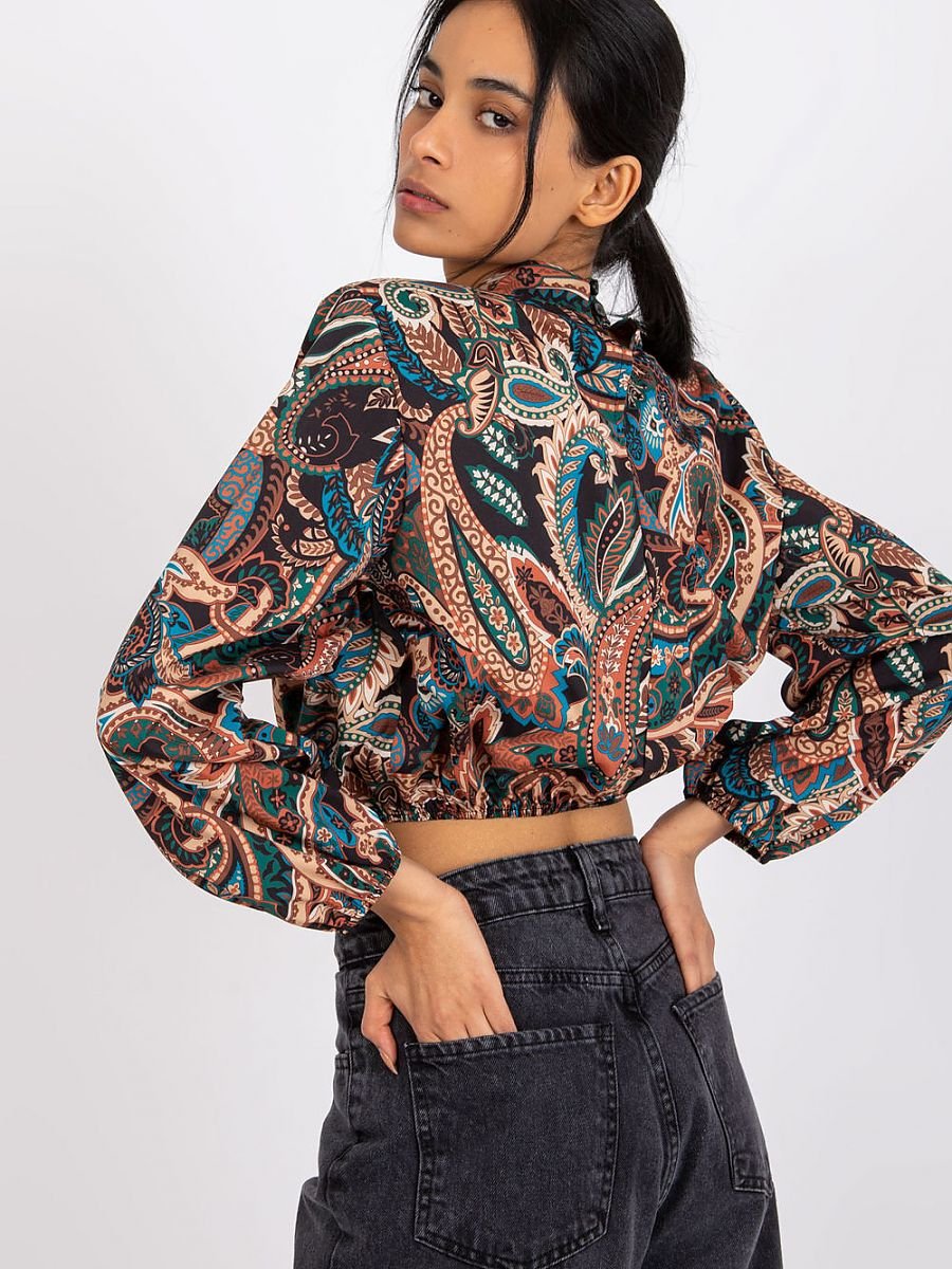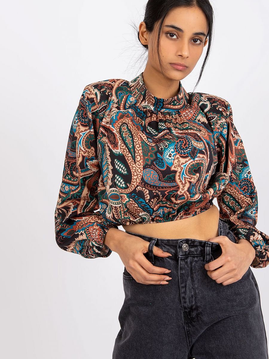 Short blouse with long sleeves and a stand-up collar. A proposition for everyday and beyond. Spandex 5 % Polyester 95 % Size...