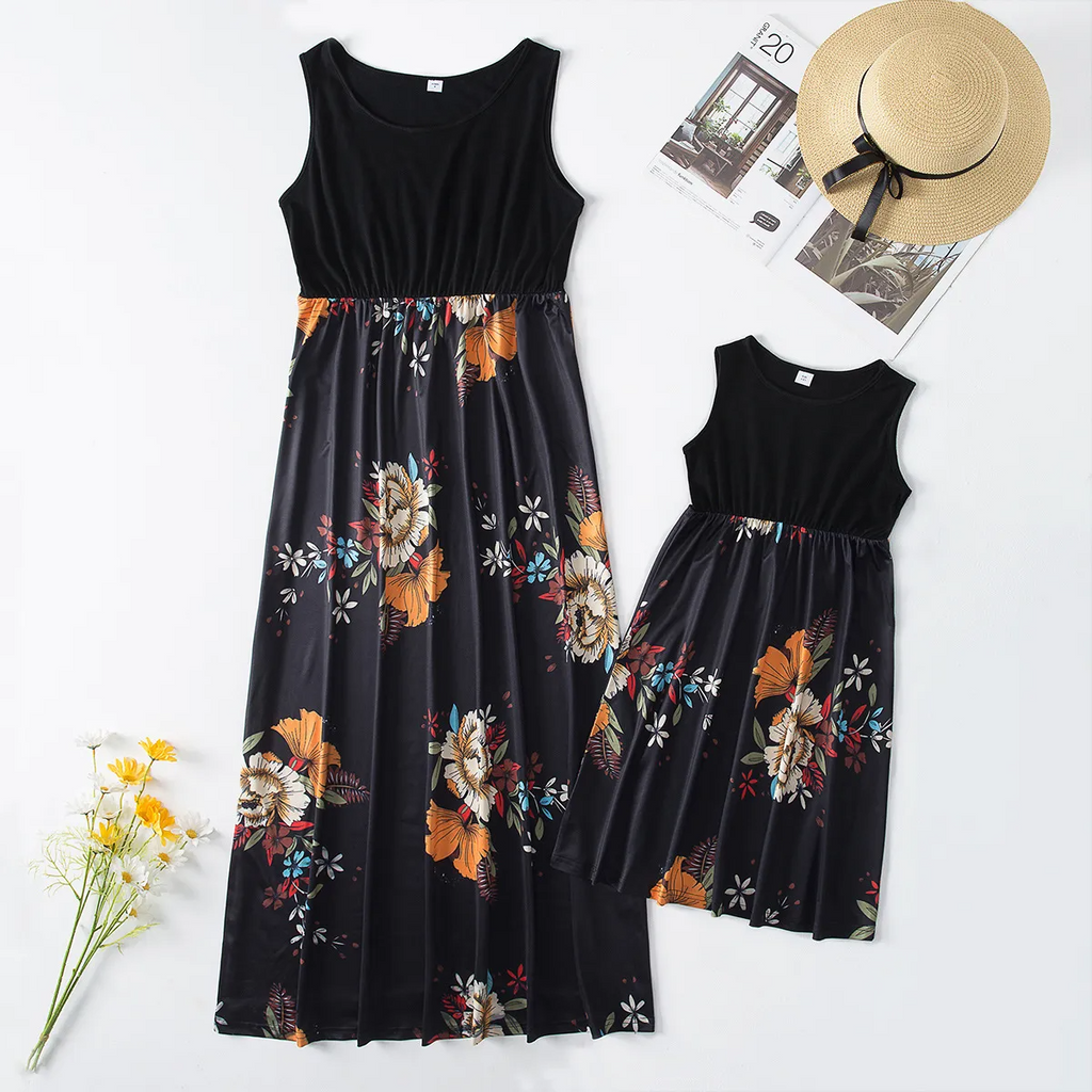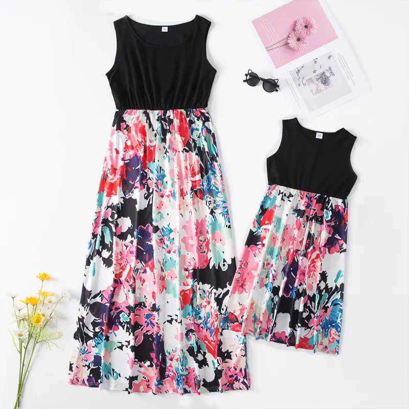 Fashion Summe Rvacation Floral Print Mother And Daughter Splicing Maxi Family Dress