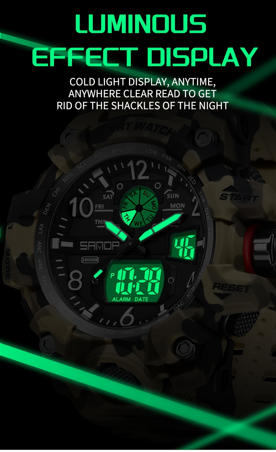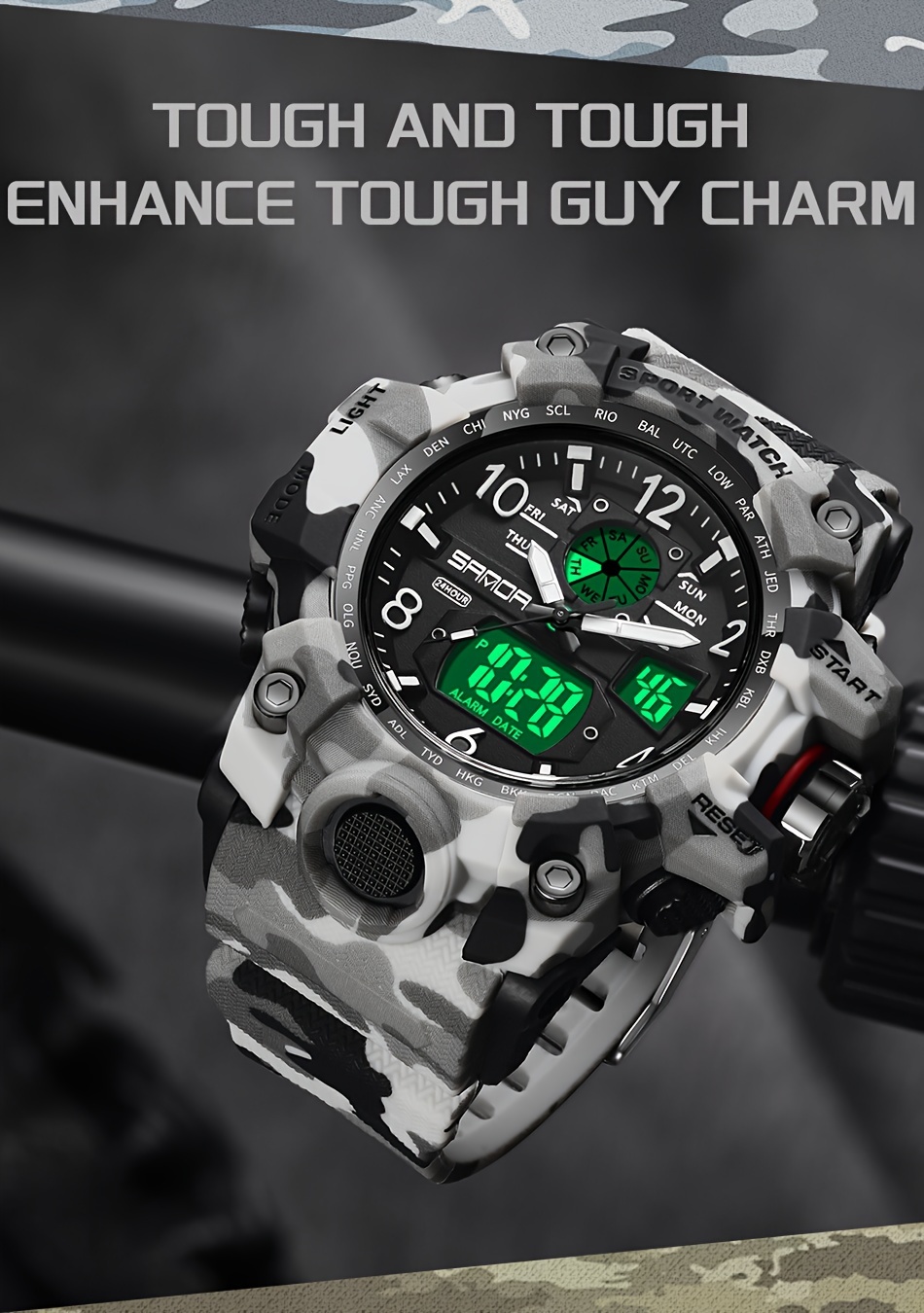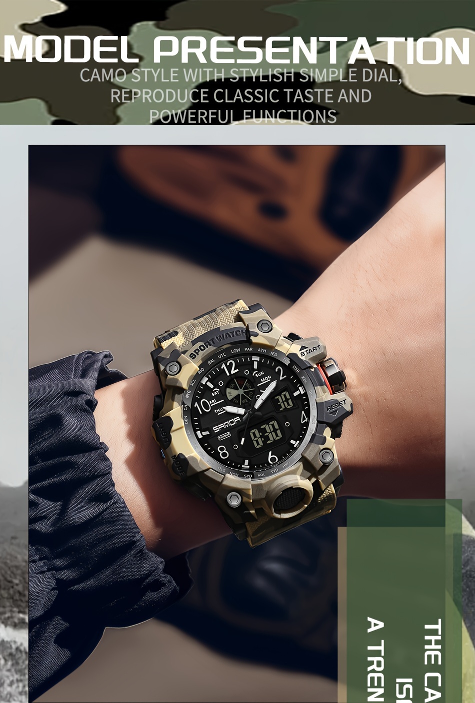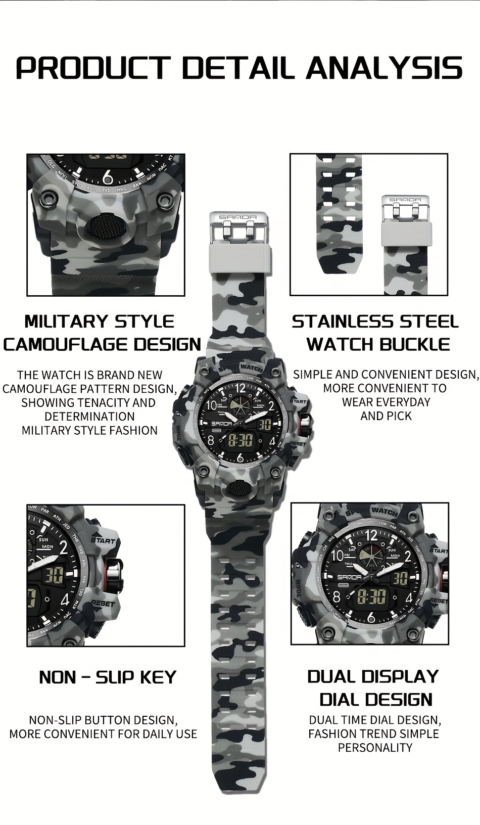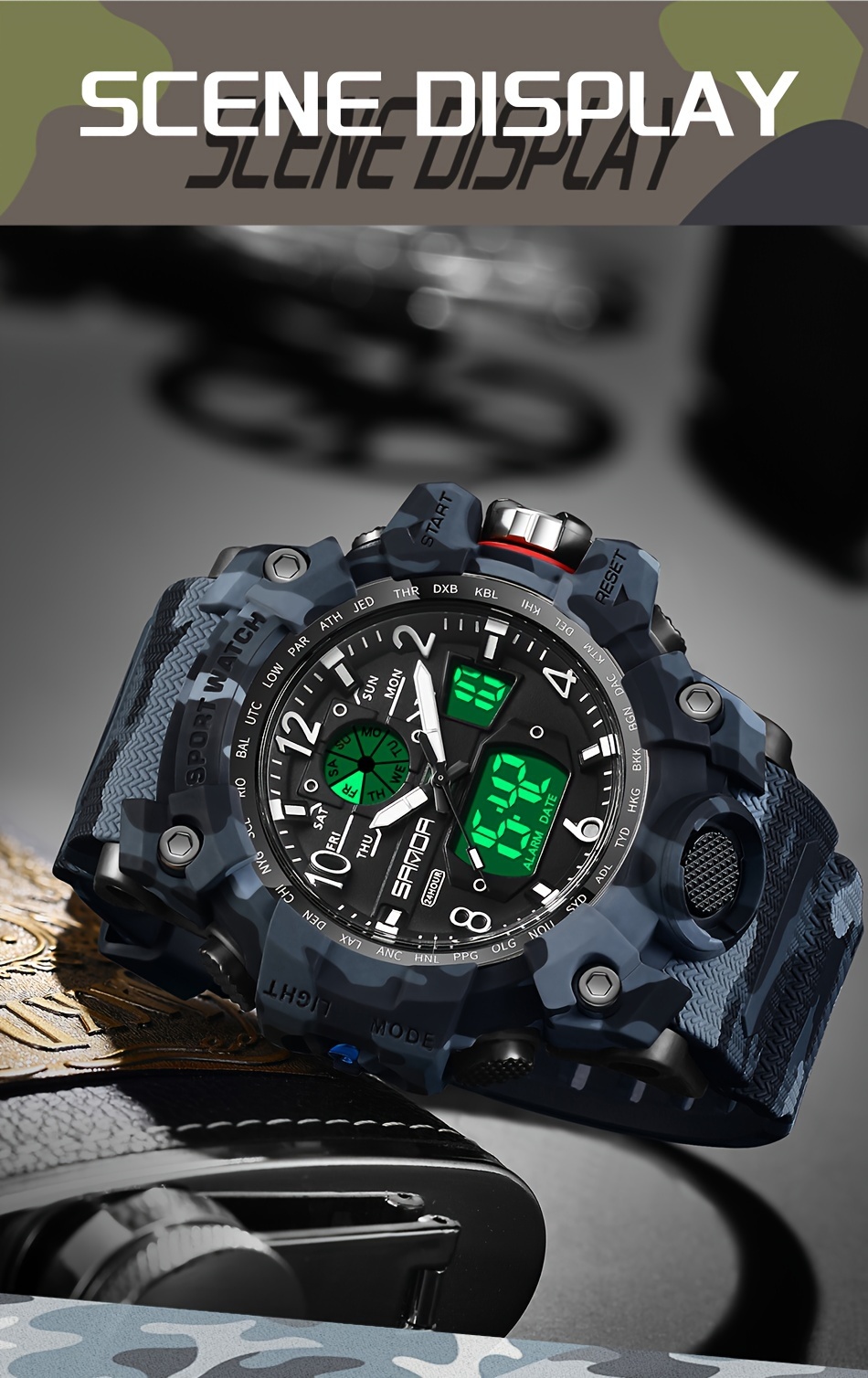 Men's Sports Watch, SANDA Dual Display Quartz Movement, Round Dial with Stopwatch, Date, Alarm Clock, Luminous Multifunctional Tactical Wristwatch with TPU Strap FS