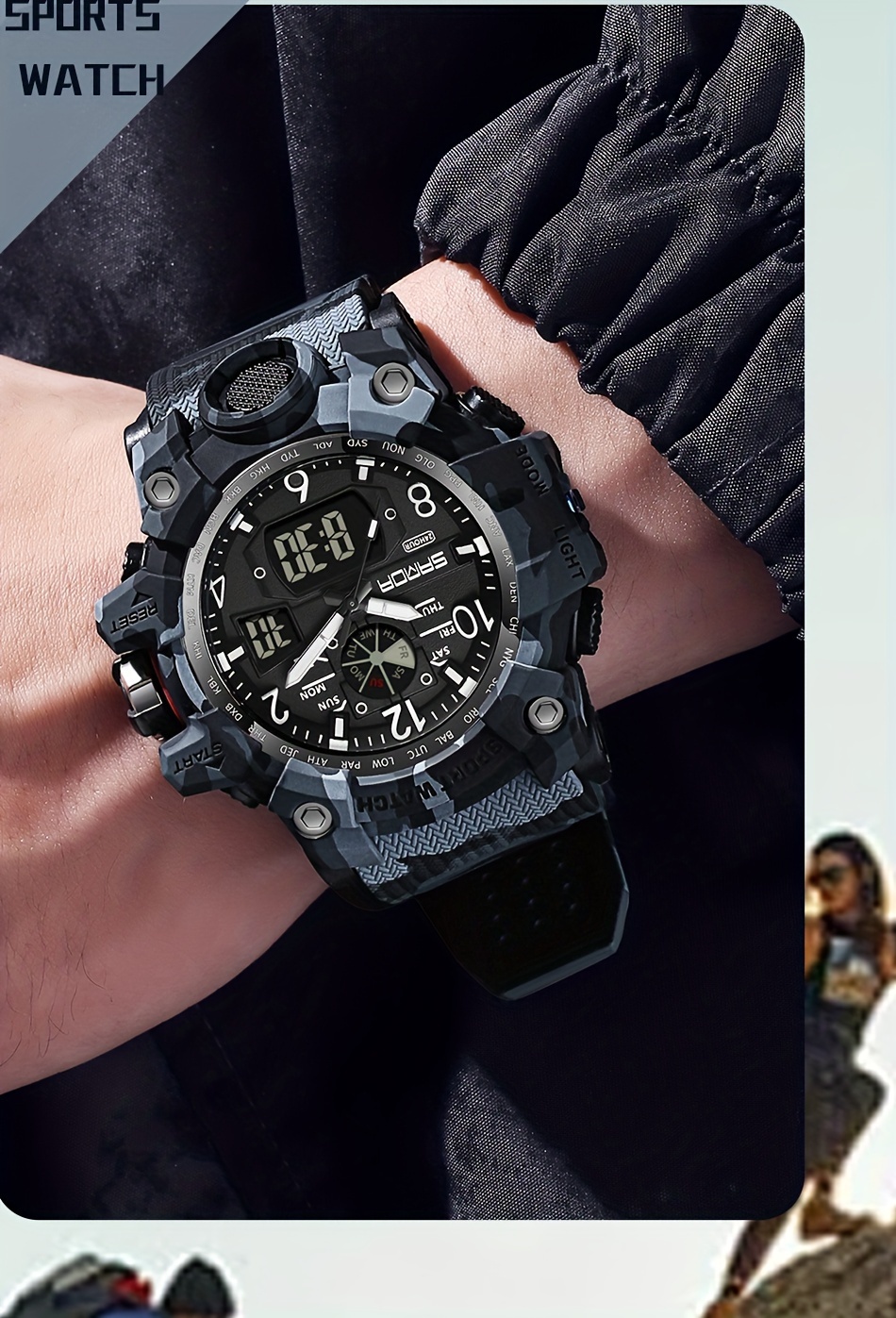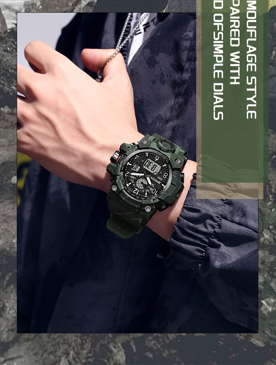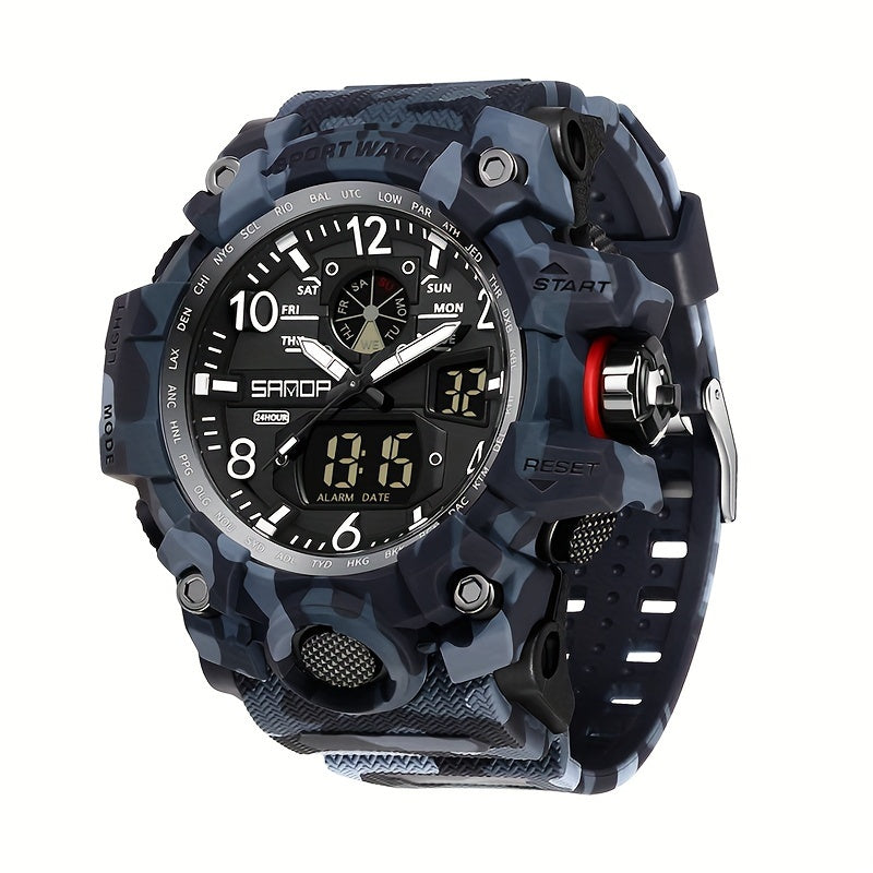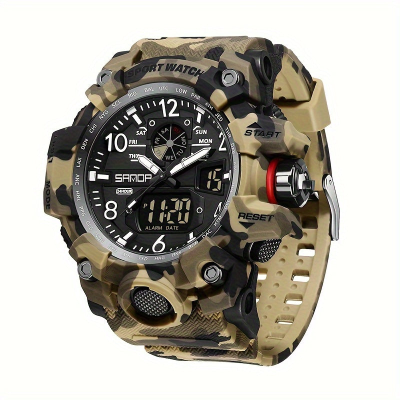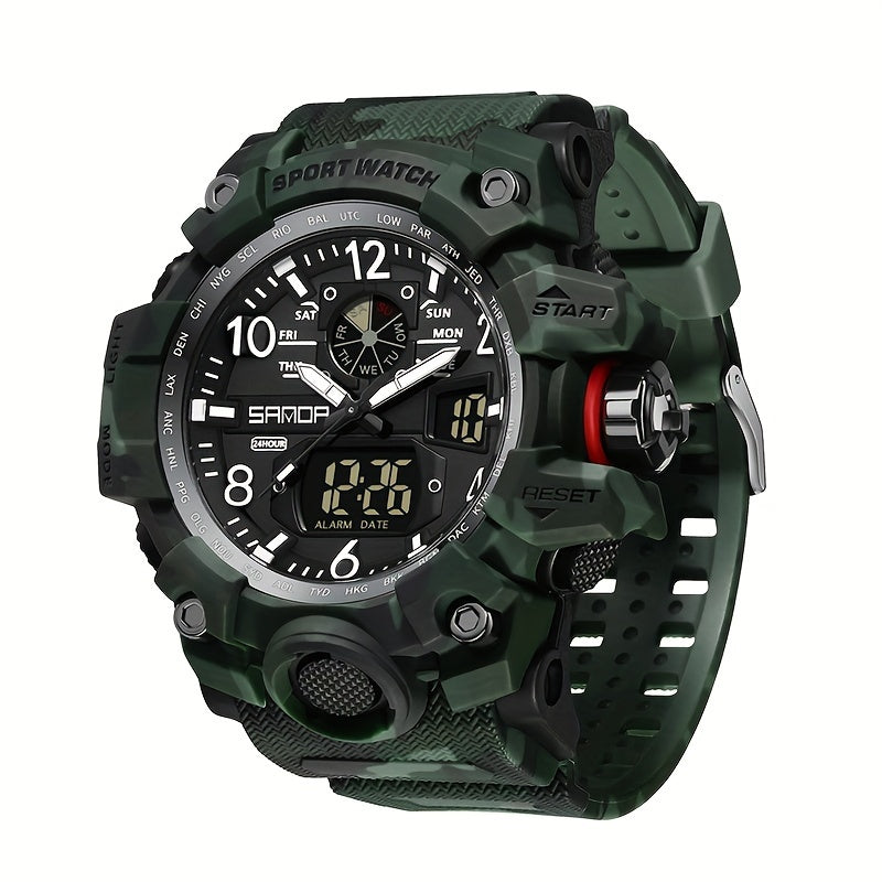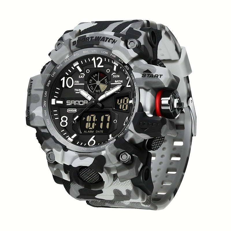 Men's Sports Watch, SANDA Dual Display Quartz Movement, Round Dial with Stopwatch, Date, Alarm Clock, Luminous Multifunctional Tactical Wristwatch with TPU Strap FS