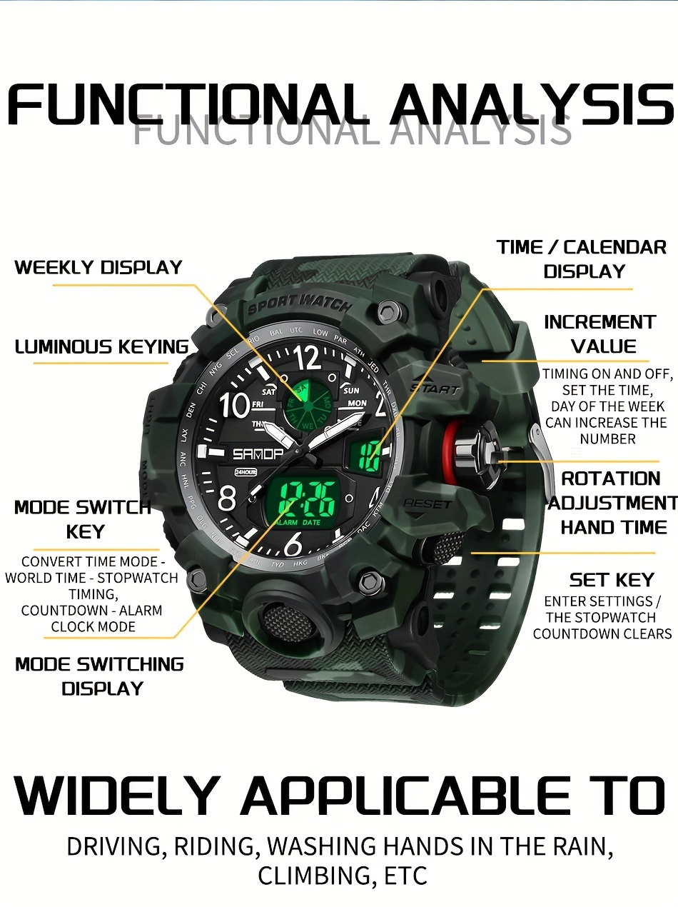 SPECIFICATIONSBrand: SANDAStrap Material: TPUWatches case material: PlasticDial Shape: RoundStyle: SportsMovement: Quartz WatchesConnection Method: NoneDrive Mode: ElectronicFeature: Date;Stopwatch;Alarm ClockDisplay Type: Double ExplicitWearing Instructions:...