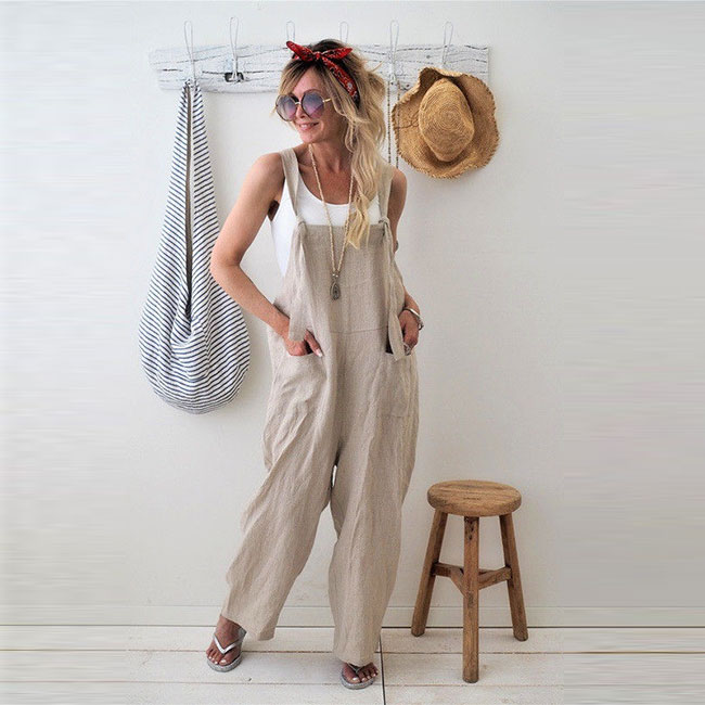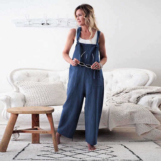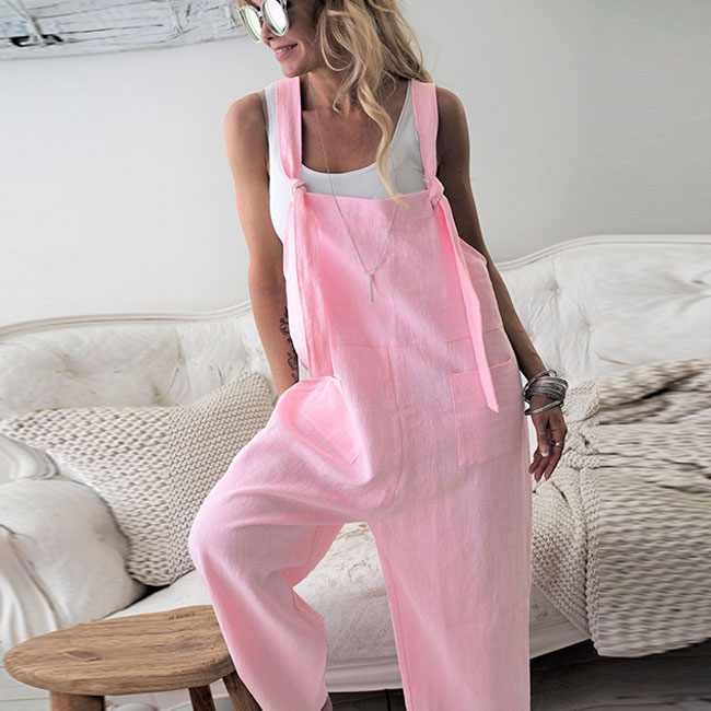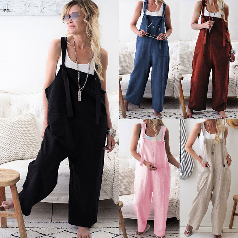 Women Solid Color Plus Size Pocket Patchwork Sling Jumpsuits